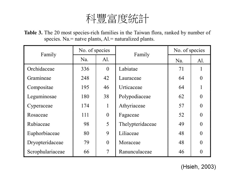 比如說我們常講臺灣的生物多樣性很高,因為臺灣高等的維管束植物大概是4,000種,比起其他國家,臺灣土地面積不大,但是因為高山地形跟氣候的多樣化,造就了臺灣的種類比其他國家多。但是當我們用4,000種這個數字來講生物多樣性的時候,其實是有點危險,可是當我們用Simpson指數來看的話,就是另外的狀況。