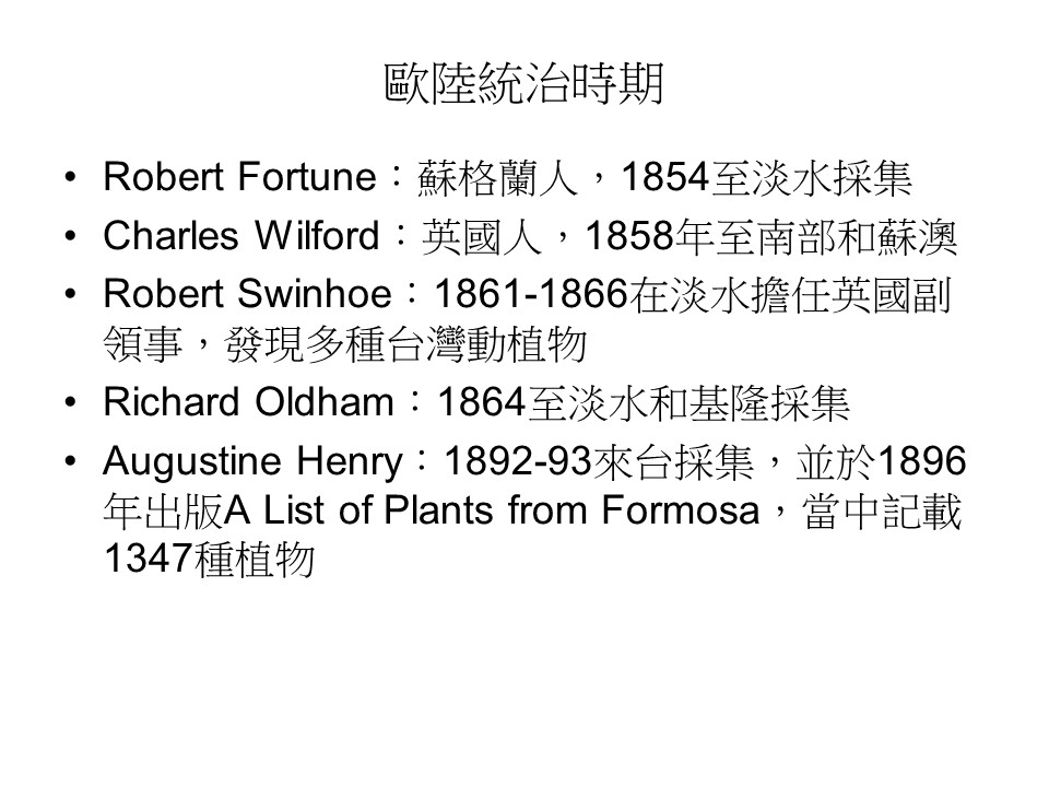 第一位探討臺灣植被的是一位林學家「山崎嘉夫」,他說臺灣大致上有熱、暖、溫、寒帶,當時日本人看到寒帶了,但是歐洲人還沒有看到,因為歐洲人採集範圍大部分是在港口附近,因為山區有原住民,歐洲人怕危險不想上山,所以大致上都看到平地的植被。但是日本政府有系統的利用一些軍事力量、警察力量進到山區去,所以能發現臺灣有溫帶植物,甚至寒帶植物。