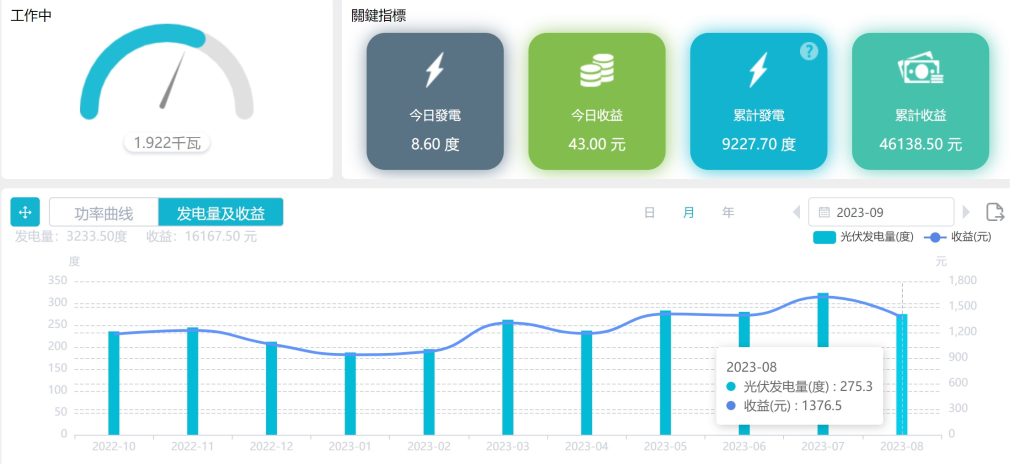 2023/8月發電量275.3度,根據中民國經濟部簡易碳排試算系統(https://carbonez.sme.gov.tw/WebPage/CalcSimp.aspx),發電效益實質轉換成照明、文書設備、冷氣等用電能量,等同於節約0.14公噸排放量。太陽能發電,使得大肚山森林復育中心內有舒適的辦公環境及良好的苗圃育苗環境,持續推進天然林復育的任務。