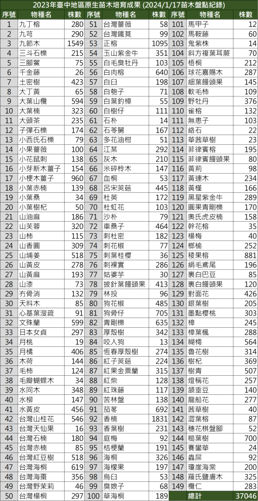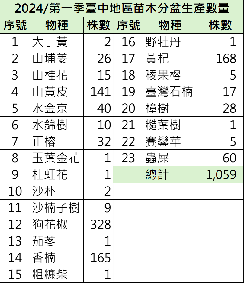 2024年第一季共計由專職及志工夥伴協助完成分盆23種1,059株臺中地區在地原生苗木,其種類及培育清單如下表。