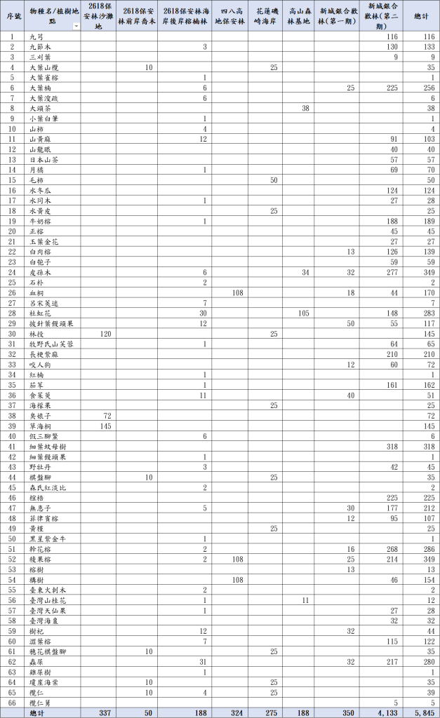 本計畫於花蓮地區目標培育及種植在地淺山天然林原生種共計6,000株,截至2024年第一季,合計完成種植66種5,845株,達成率97%,其種植種類及株數清單如下表。