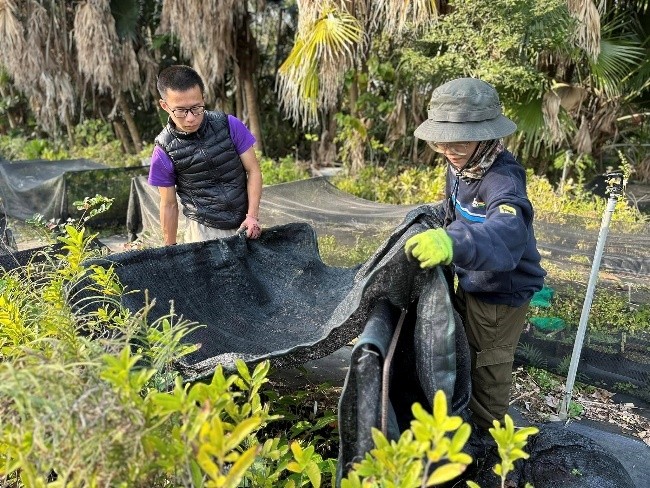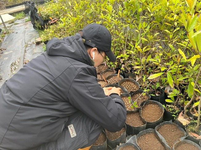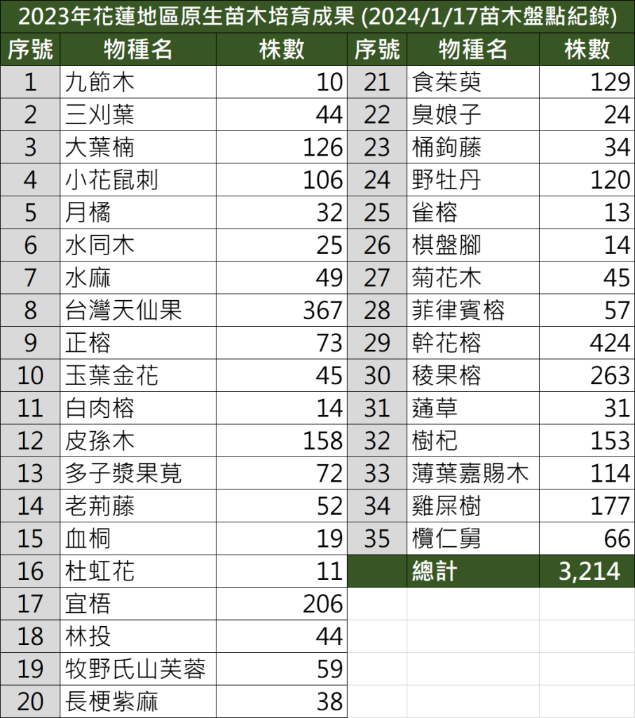 - 苗木盤點:盤點於2024/1/17完成紀錄,種源培育自花蓮地區(包含台東及海岸物種)的原生苗木盤點結果共計有35種3,214株。