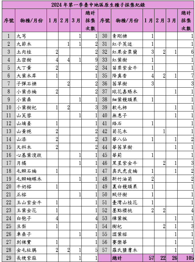 2024年第一季於臺中地區共計採集57種原生種種子,採集種類及次數統計如下表。