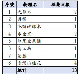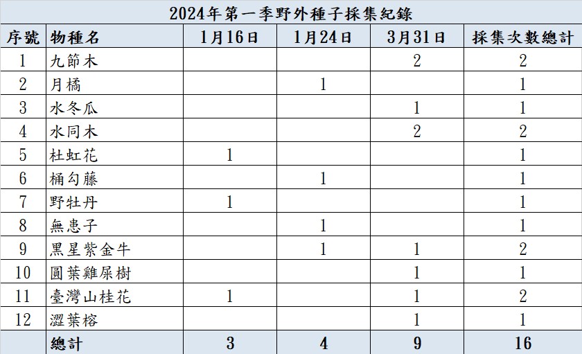 2024年第一季於花蓮地區共計採集12種原生種種子,其採集種類及次數如下表。