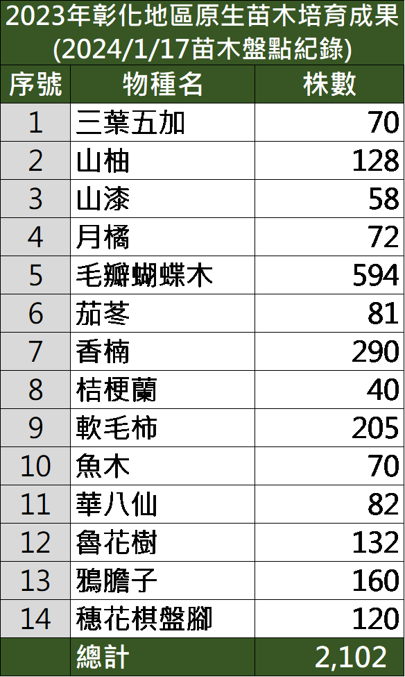 2023 年度大肚山森林復育中心(苗圃)苗木盤點於 2024/1/17 完成紀錄,種源培育自彰化地區的原生苗木盤點結果共計有 14 種 2,102 株; 中部地區(臺中)苗木盤點尚有 149 種 37,046 株。其彰化及臺中地區苗木盤點記錄詳如下圖表。