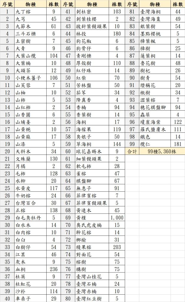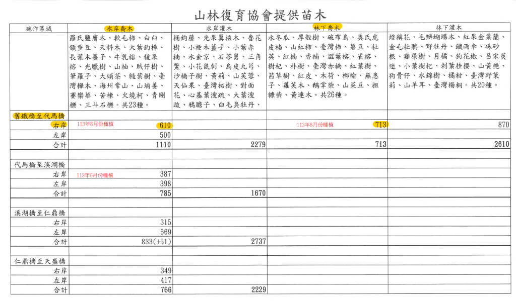 下圖表為本次現勘資料:臺灣山林復育協會提供東螺溪生態綠化使用之植栽種類數量及配置說明。