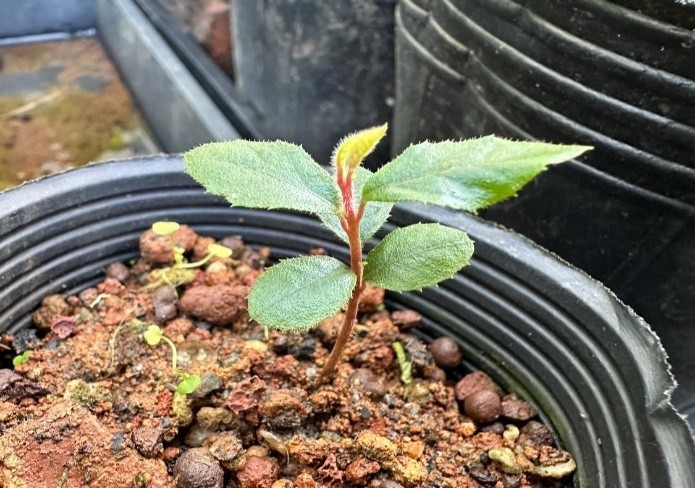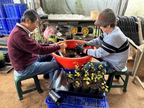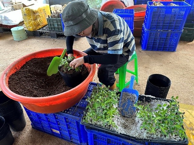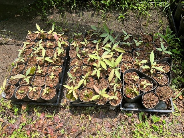 2024 年第一季完成 148 株採集自彰化地區的毛辦蝴蝶木換盆生產作業。換盆作業係指萌發後的幼苗長高至約 10 公分,並具有木質化的莖,由專職或志工夥伴將 6 吋播種盆中,約數十株幼苗,一一單株換盆至 3.5 吋的苗盆內,並依物種生長所需的環境移至苗圃中遮陰、半遮陰、全日照且有自動澆灌系統的位置,繼續培育至苗高約 1 公尺後,即可準備出栽至彰化在地復育區種植。