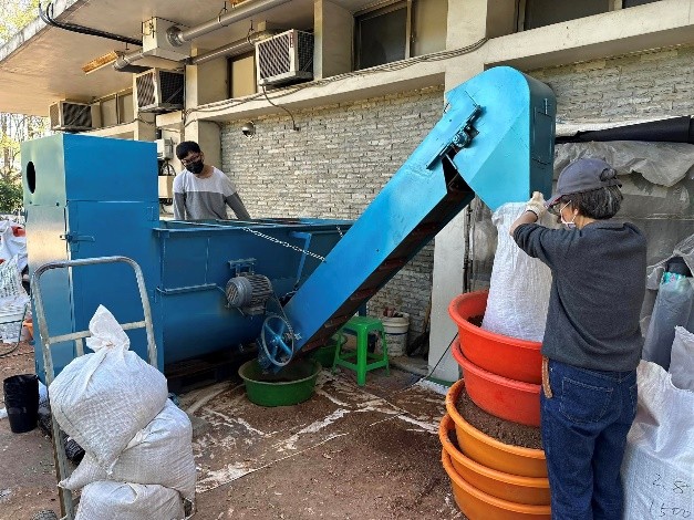 大肚山森林復育中心內定期進行苗盆除草作業,以避免雜草覆蓋苗木造成死傷。