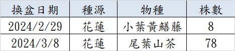 2024年第一季完成2種86株花蓮地區原生苗木換盆作業。