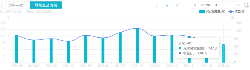 2025/1月發電量137.3度,發電效益實質轉換成照明、文書設備、冷氣等用電能量。太陽能發電,使得大肚山森林復育中心內有舒適的辦公環境及良好的苗圃育苗環境,持續推進天然林復育的任務。