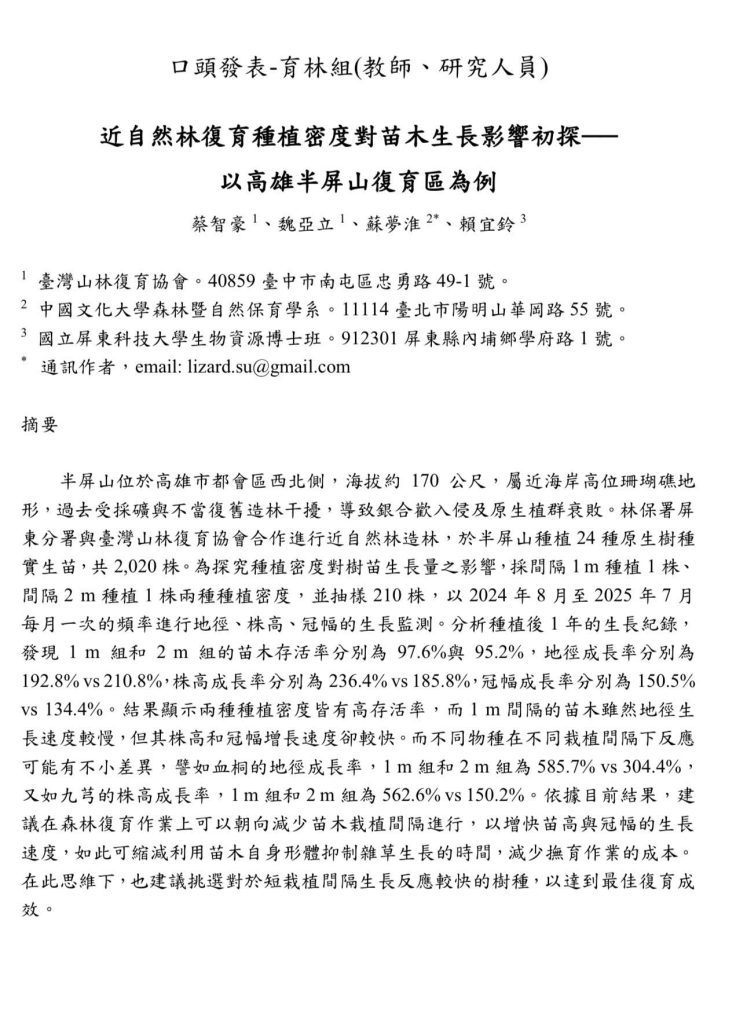 感謝高雄志工們的支持,我們協會將高雄半屏山復育區的生長監測資料整理成論文,由魏亞立報名「2025森林資源永續發展研討會」做口頭發表,謝謝所有工作夥伴與亞立的付出,也謝謝林保署屏東分署大力支持高雄淺山植群復育!