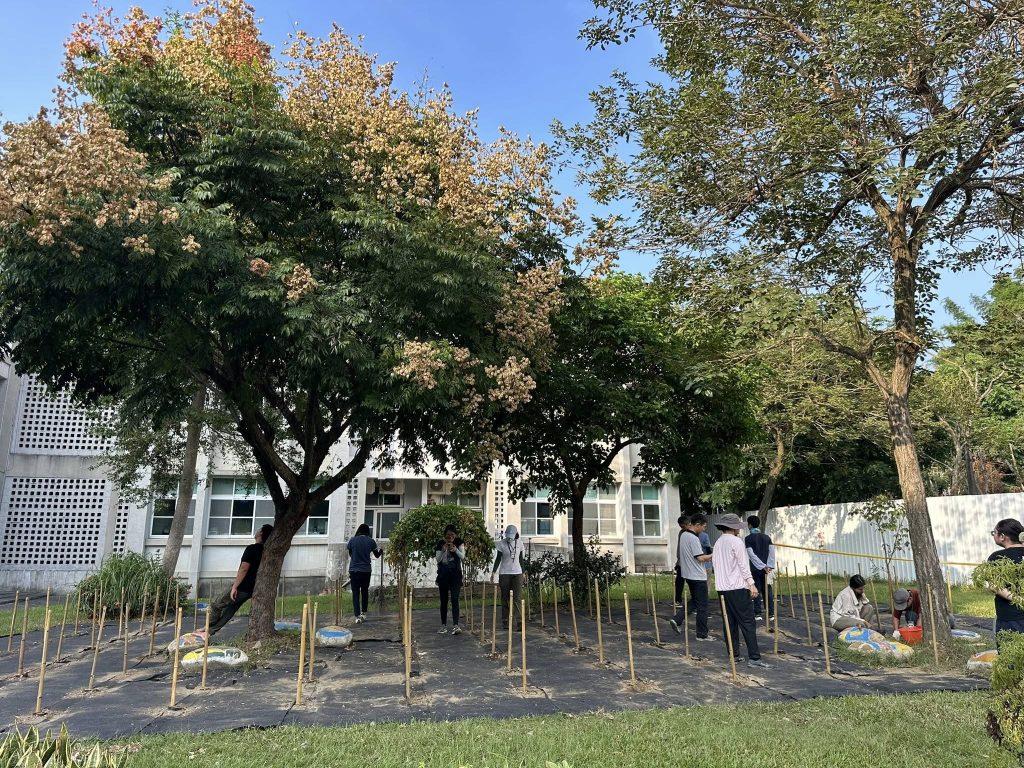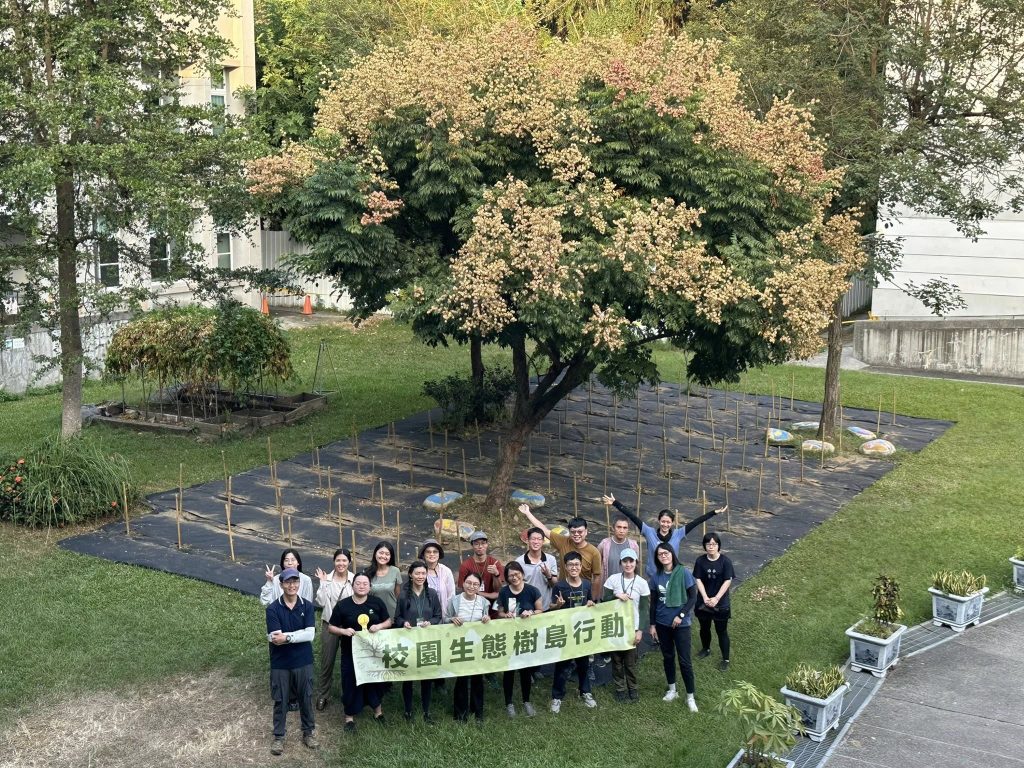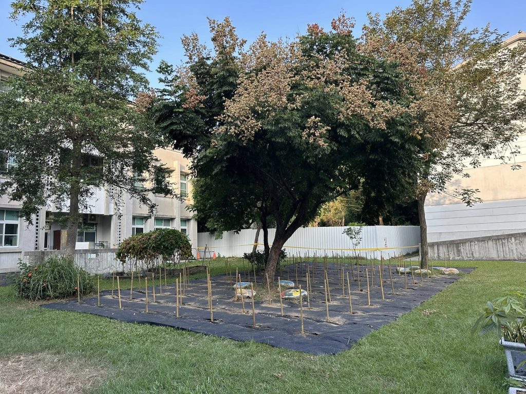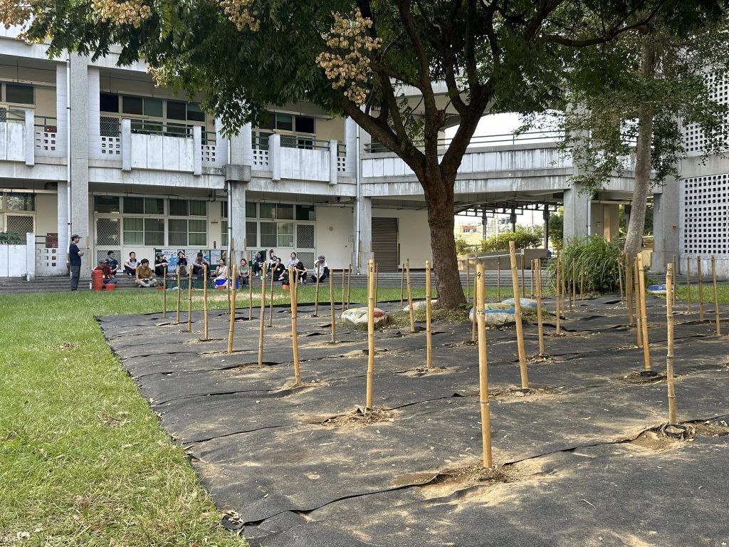 最後我們還把每個植穴都插上竹竿及寫上編號,並將每個植穴位置對應周邊建築物、太陽方位、樹蔭,來紀錄光度級數,之後我們將以此配置適合光度的樹苗,來讓樹島發揮最佳的功能。校園生態樹島不僅助益於生物多樣性,也將豐富相關課程的教學,期待藉由校園生態樹島的推動,來達到提升國民生態素養的目標!