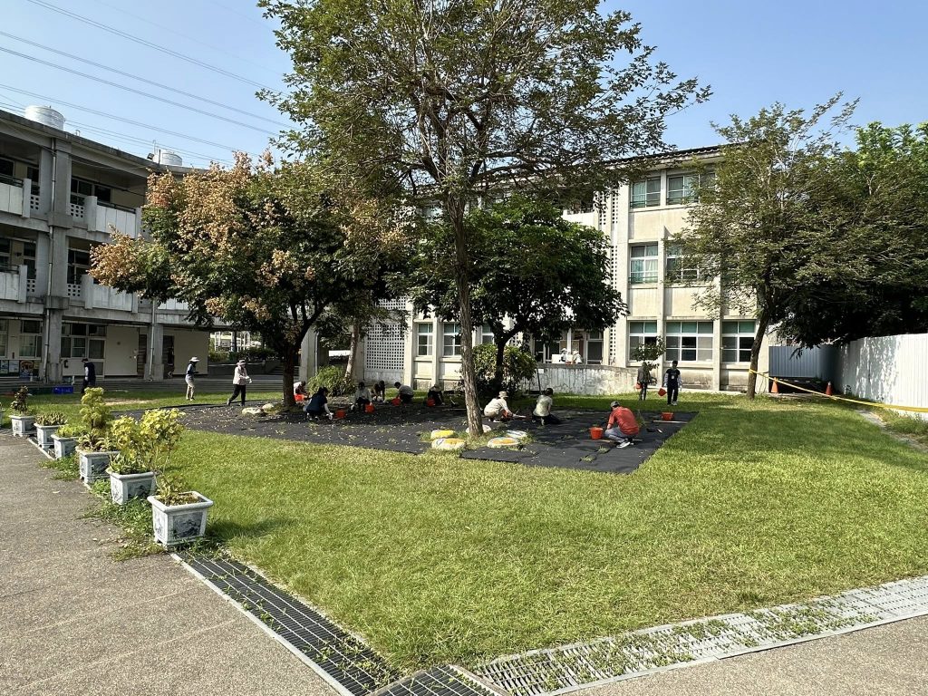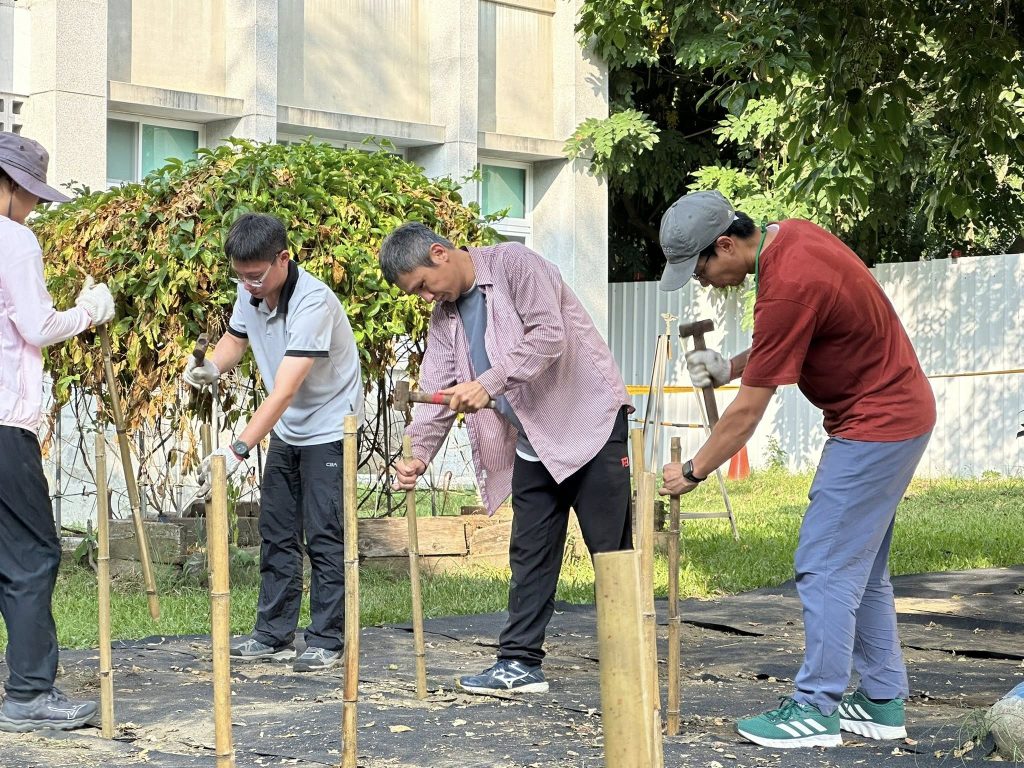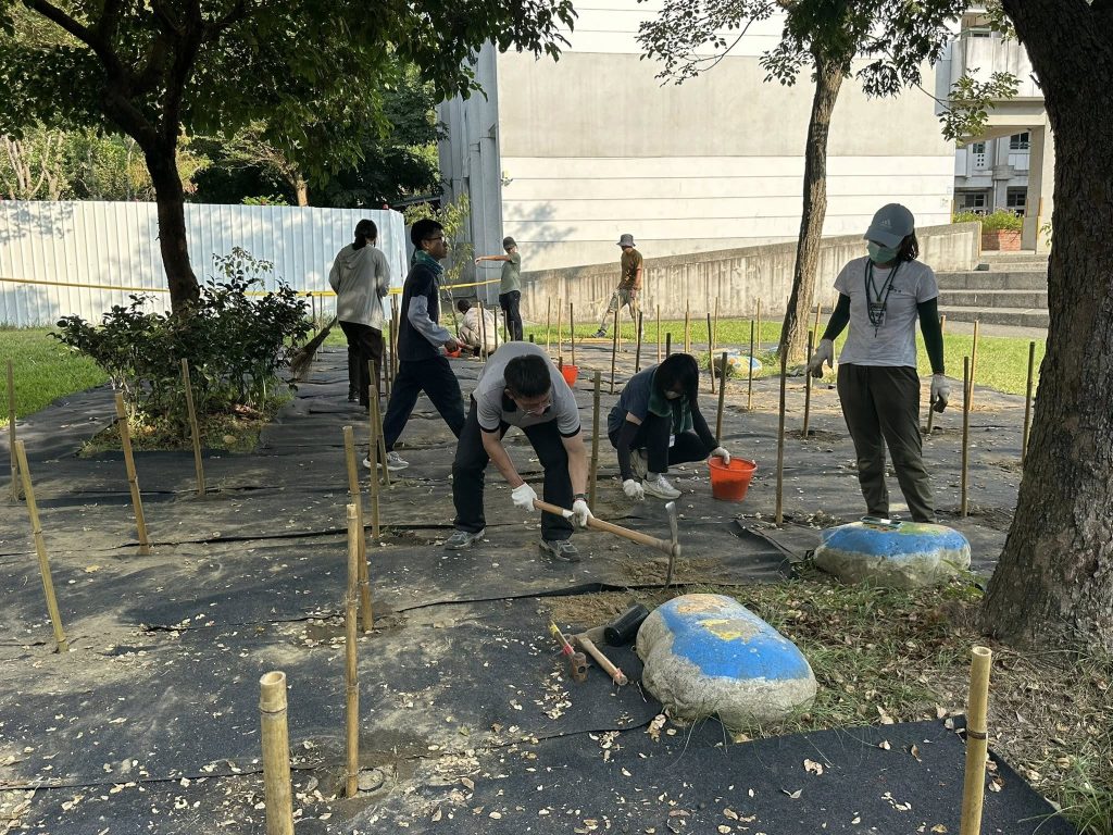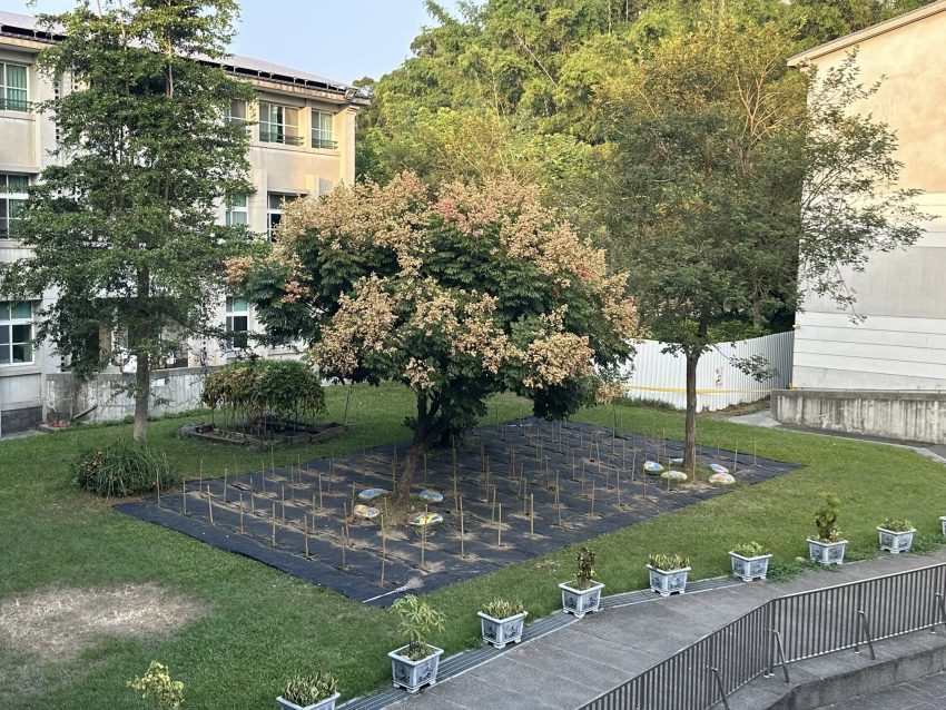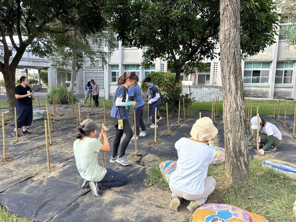 最後我們還把每個植穴都插上竹竿及寫上編號,並將每個植穴位置對應周邊建築物、太陽方位、樹蔭,來紀錄光度級數,之後我們將以此配置適合光度的樹苗,來讓樹島發揮最佳的功能。校園生態樹島不僅助益於生物多樣性,也將豐富相關課程的教學,期待藉由校園生態樹島的推動,來達到提升國民生態素養的目標!