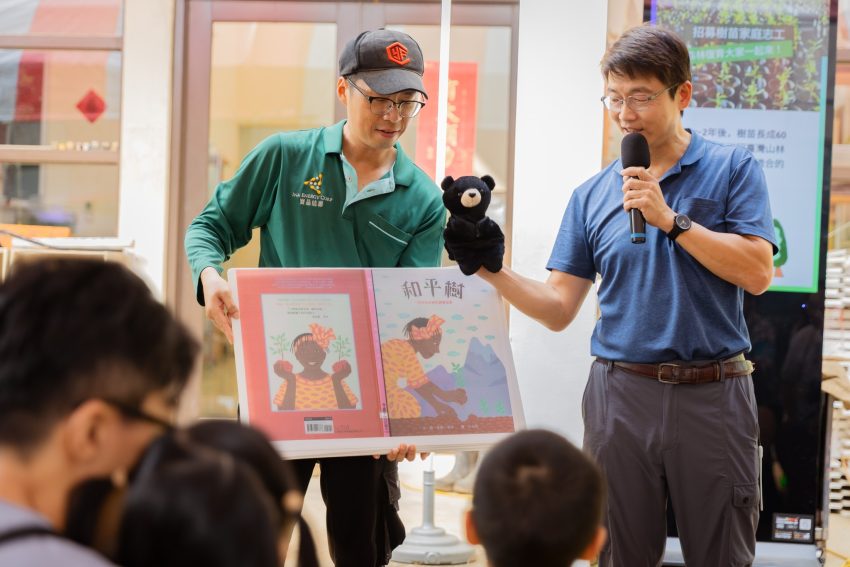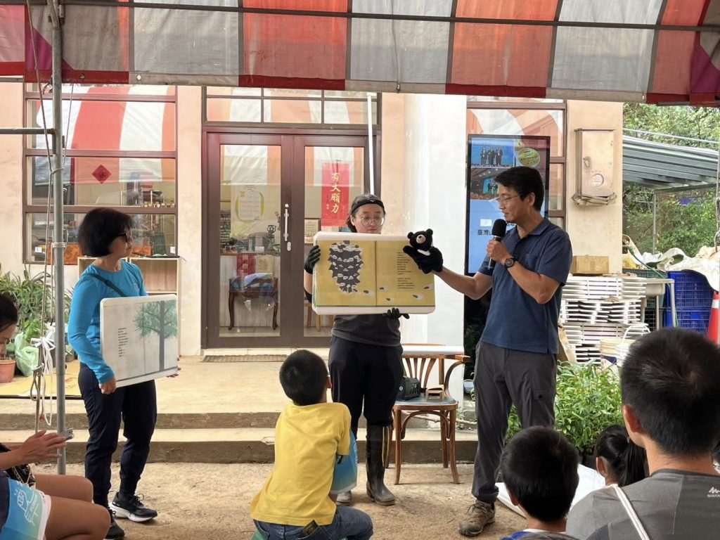 11/8富邦金控企業志工前來大肚山森林復育中心進行社會服務,只要有小朋友的場合,蔡智豪老師便會以「黑熊老大布偶」來為小朋友講繪本故事。活動中,蔡老師也藉機跟大人說明植群復育的學理知識,再透過實作的服務工作,讓參與者了解植群復育的工作內容。