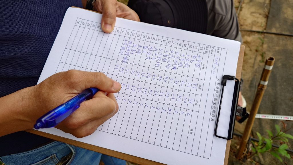 《復育工作紀實:后里森林公園生態樹島生長監測 》2025/11/10 Posted on 12 十一月, 202512 十一月, 2025 1. 組別:生態造林組 2. 工作內容:測量200株樹苗樹高、冠幅測量。 4. 工作人員:智豪、有倫、森粼生態顧問公司凱鋐、育溱 5. 日期:2025/11/10 7. 地點:臺中后里森林公園 8.備註:今日開花樹種有「臺灣鐵莧、車桑子、紅仔珠、小葉赤楠」 ~守護山林~請您支持《臺灣山林復育協會》【官方網站】https://www.reforestation.tw【電子發票捐贈愛心碼】5 2 3 0(我愛山林)