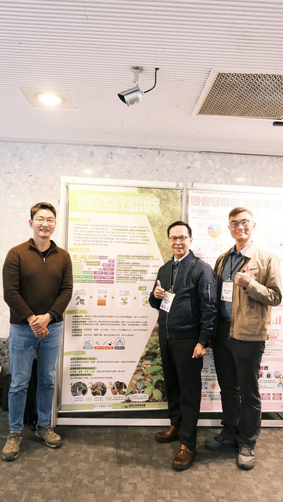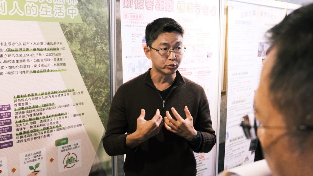 在海報發表中,我們分享臺中淺山植群復育的成果,如大肚山森林復育中心的成立,臺中都會公園的森林復育、大肚山防火生態林的建置、校園生態樹島的推動等,這些成果係以民間為主體,採公私合力的方式,導入企業ESG參與,最後產生典範效益,而成為其它縣市參考的借鏡。