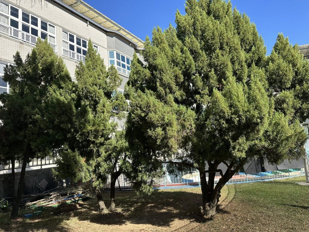 3.區域內有4棵龍柏,高約5公尺,冠幅約3~4公尺。