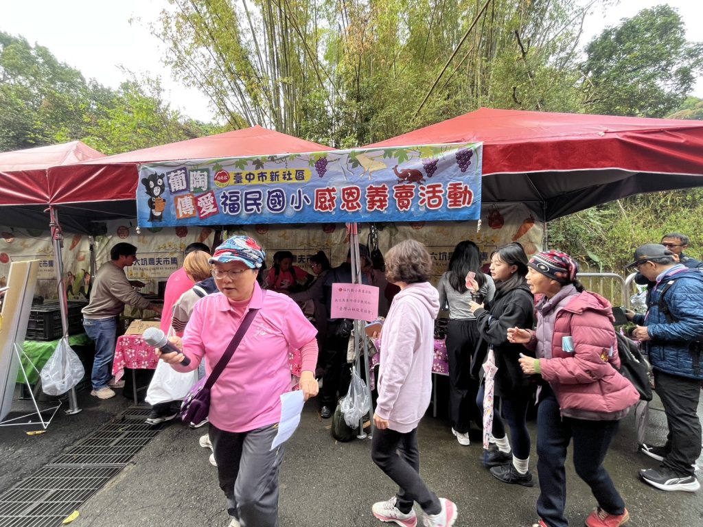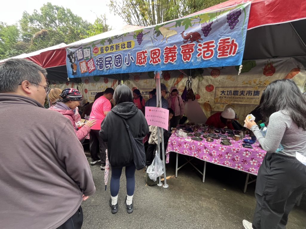 本次義賣活動由福民國小師生總動員,結合在地農友贊助的新社白毛台甜美多汁冬葡萄,以及孩子們親手製作的生活陶藝作品,共準備 300件陶藝花器與120包白毛台葡萄,於大坑9號步道口前進行義賣。活動當日雖遇上陰雨天氣,卻絲毫未澆熄孩子與師長們的熱情,學生們在現場奮力叫賣,以滿滿活力吸引往來民眾目光,紛紛捧場支持。