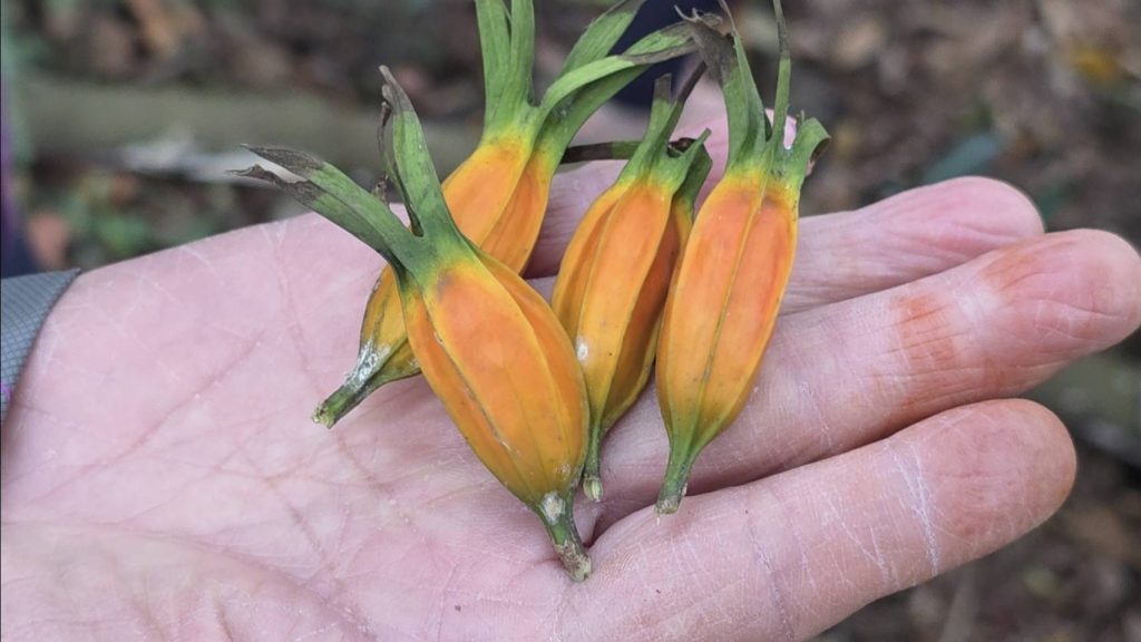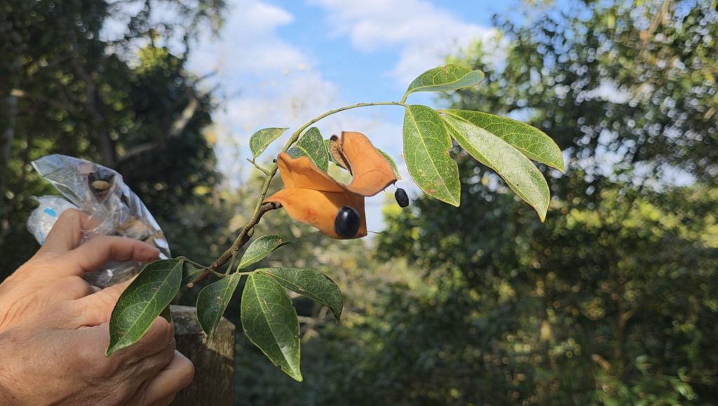 這趟最振奮的時刻,出現在志工純佑抬頭發現一棵結實纍纍的山黃梔。黃橙橙的果實飽滿硬實、幾乎無蟲蛀,現場立刻響起「開大獎了」的笑聲。秀育老師分享,過去在其他步道見過山黃梔,但多半果實受損、難以採收,這次能一次取得完整、健康的種子,非常難得。她也提到先前在五號步道懸崖邊,首次發現頷垂豆母樹的經驗——從遠看不明顯的咖啡色果莢,到近距離確認裂開後垂下的種子,那份雀躍至今記憶猶新。對她而言,這些發現從來不是偶然,而是長期觀察與反覆驗證的結果。