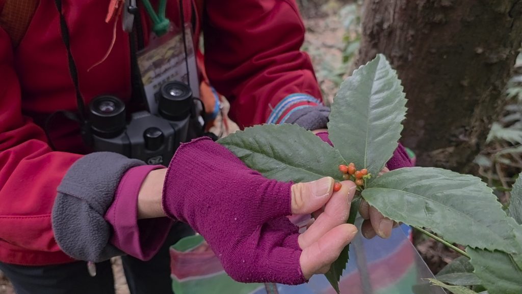 那天,我以參與者的身分,走完一趟完整的採種行程。這兩條步道對我來說是全新的體驗:過去在爬大坑8號步道,步伐輕快、視野開闊;如今轉到5-1與5號步道,圓形木棧道迫使人專注腳下,步伐自然放緩,視線也隨之打開,開始留意樹冠、枝條末端與落葉層的細微變化。沿途,我們記錄並採集了狗骨仔、紅果金粟蘭、大葉木犀、白匏子、紅葉樹、九節木、降真香、山紅柿、山黃梔、墨點櫻桃等十餘種原生樹種。每一次停步,都是反覆確認果實成熟度與採收必要性的過程,有些果實即使近在眼前,我們仍選擇放過。