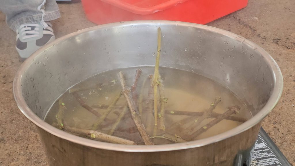過程中,孩子們也學習「等待」。有些孩子不停看時間、詢問是否煮好了?有些孩子緊盯著鍋子,深怕錯過樹皮煮軟的時機;修剪構樹枝條要時間、煮樹皮要時間,做好的紙張也要靜靜等待乾燥。每一個步驟,都需要「等待」。