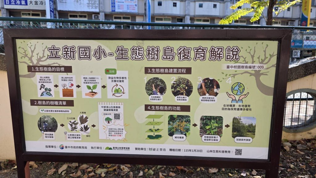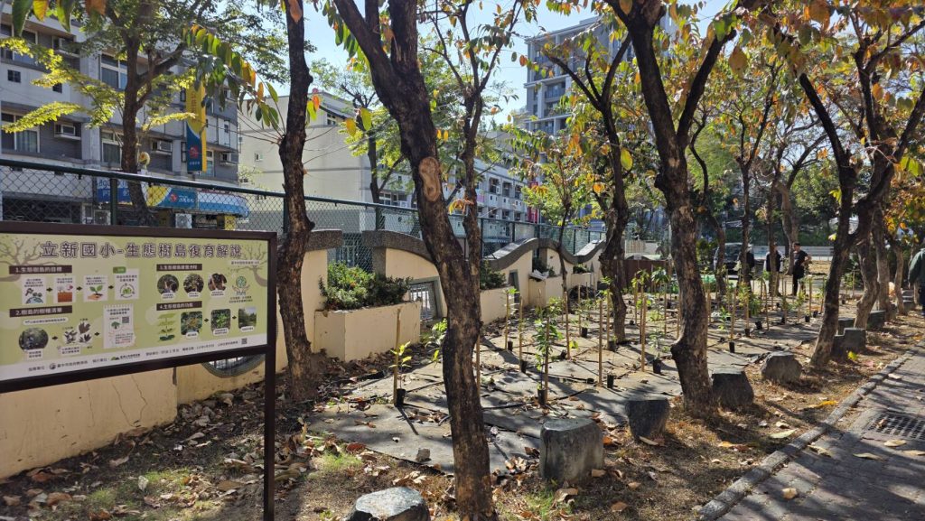 立新國小的校園生態樹島,種植了 32 種、共 67 株木本植物,樹種組成對應臺中盆地 500 公尺以下應有的森林樣貌,包含大葉釣樟樹、薄葉嘉賜木、梧桐等重要物種,物種豐富度媲美科博館戶外植物園。這樣的配置,為未來 20 年建立了一處極具指標性的生態據點。