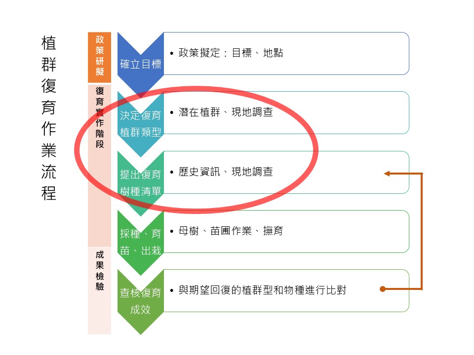 我們要先「決定復育植群的類型」,這會牽扯到「潛在植群」跟「現地調查」。決定植群復育類型之後,接下來要「提出復育樹種清單」,這要查找歷史資訊,以及進行現地調查,之後才可以進入下一步驟的「採種、育苗、出栽」。