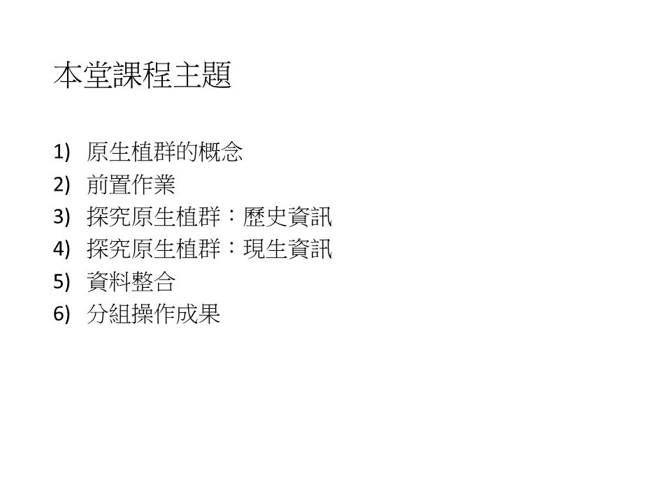 這一章的課程主題,依序是 (1) 原生植群的基本概念,(2) 植群復育的前置作業,就是探討潛在植群。了解潛在植群之後,接下來要探究當地可能的原生植群,這部分分成(3)歷史資訊的探究,以及(4)現生資訊的探究。