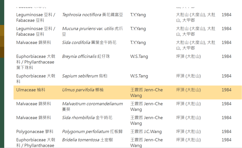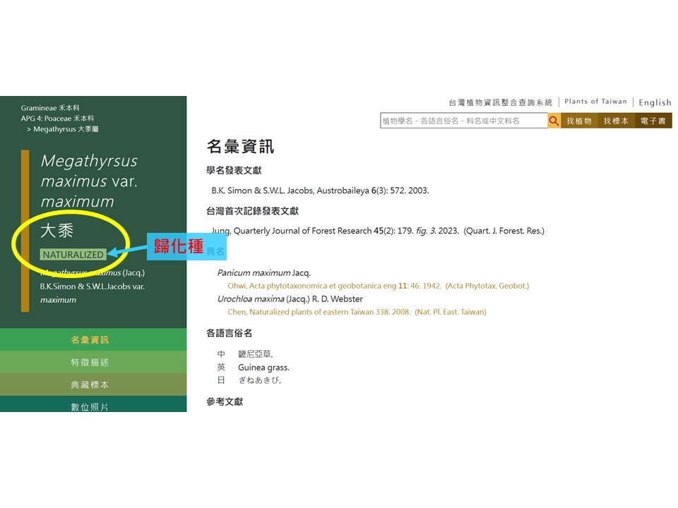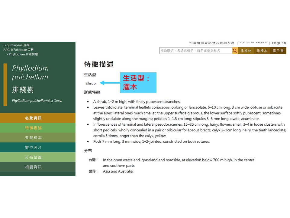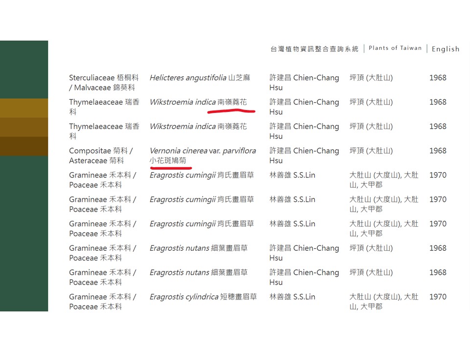 「外來種」要怎麼找?在臺灣植物資訊整合查詢系統 (https://tai2.ntu.edu.tw/) 當中,在物種名稱的下面,如果有個字叫「Naturalized 」,意思是「外來歸化的」,就可以判定為外來種,把它從名錄刪掉。