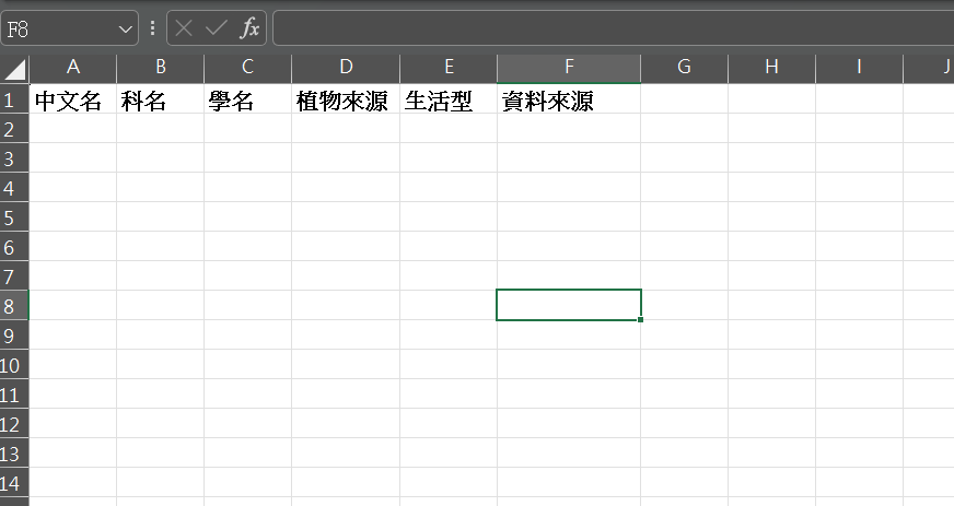 在資料整合的步驟,首先是建立一個植物名錄Excel檔,第一列有基本的「學名」、「中文名」、「來源」、「地點」等這些資訊。