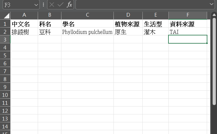 另外,物種的科名,中文科名跟拉丁文科名一定要分開成兩種資料,也就是兩個欄位,這樣才能分析。Excel軟體的特性是,一個欄位只能有一種資料,所以大家要養成習慣,Excel一個格子只能有一種資料,盡可能越單純越好。