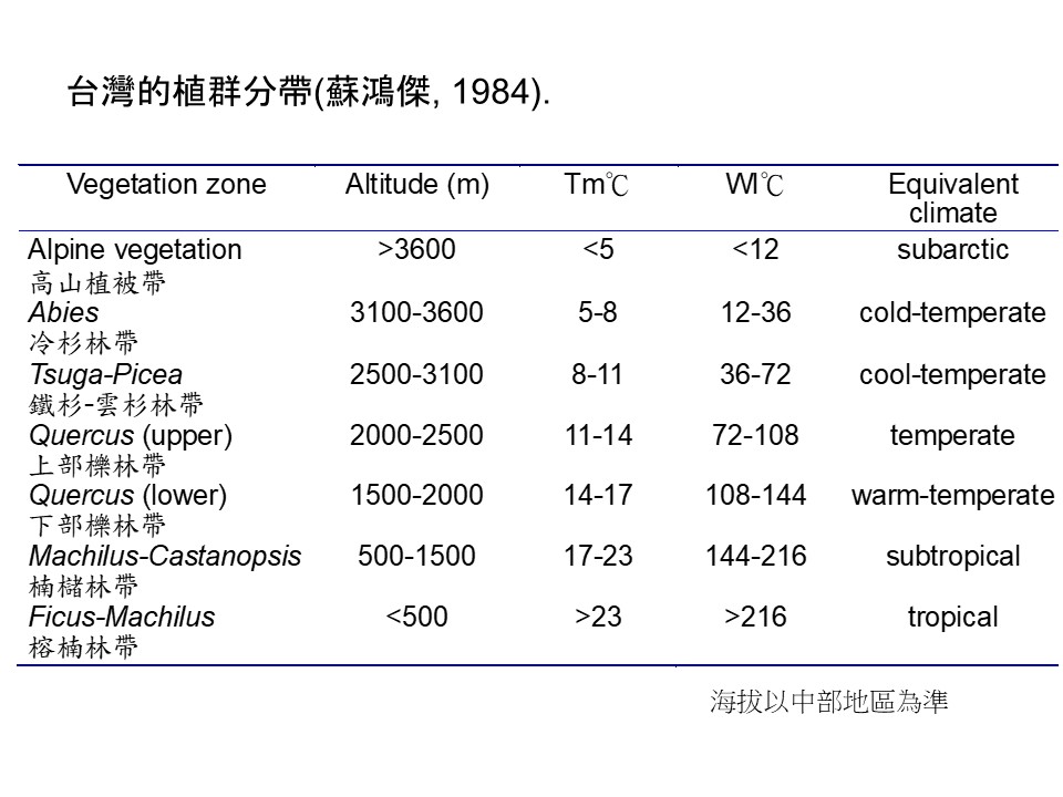 主要的「潛在植群」可以根據臺灣大尺度的植群分帶架構來討論。我們來看之前課堂提到的蘇鴻傑老師的版本。