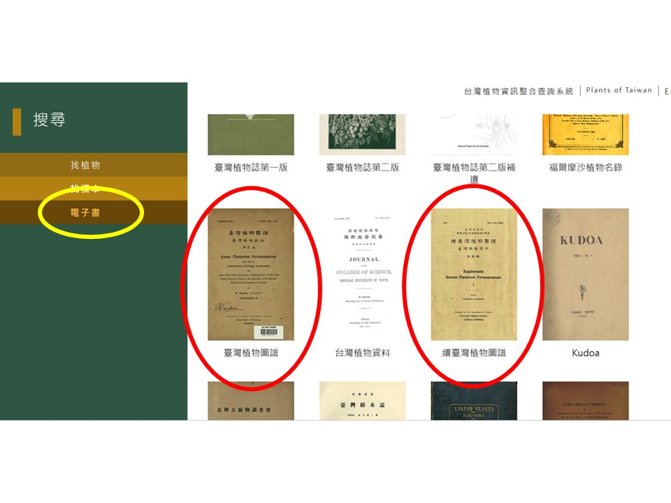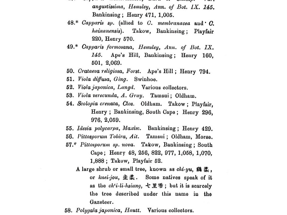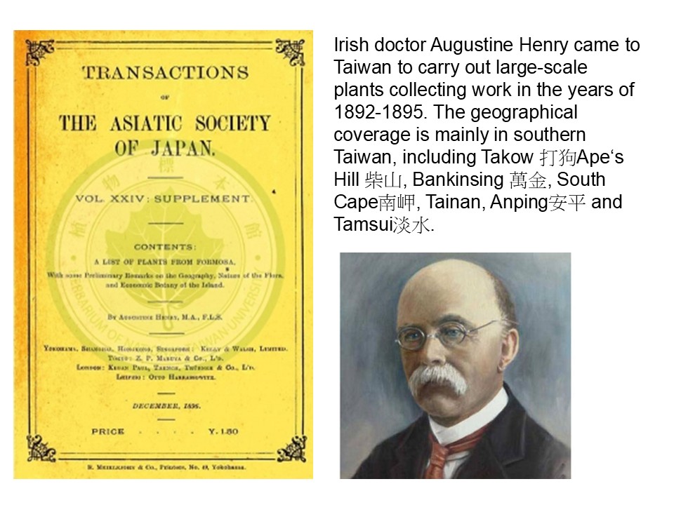 i. A List of Plants from Formosa (福爾摩沙植物名錄):1896年出版,主要記載愛爾蘭醫生奧古斯汀亨利(Henry, Augustine)於1892-1895年間來到臺灣,進行大規模之植物採集工作,其主要的採集範圍是在臺灣南部,計有打狗(Takow)、壽山(Ape’s Hill)、萬金庄(Bankin-sing)、鵝鑾鼻(South Cape)、臺南(Tainan)、安平(Anping)及淡水等地區