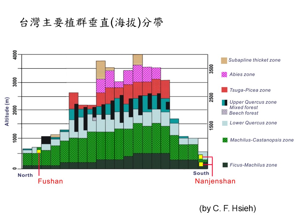我們看雪山的潛在植群,比如榕楠林帶它的海拔大概只有300公尺而已,頂多再高一點;但是到玉山這一邊的話,榕楠林帶的海拔是500公尺,也就是我們講的最標準的海拔;如果在臺北,大概是在福山植物園這邊(直條左二, Fushan),所以緯度如果跟福山植物園差不多的話,榕楠林帶只剩下海拔100公尺而已,超過100公尺可能已經開始轉換成楠櫧林帶了。所以我們可以用這張圖來知道潛在植群的海拔,特別是南部、北部植群的海拔參考。
