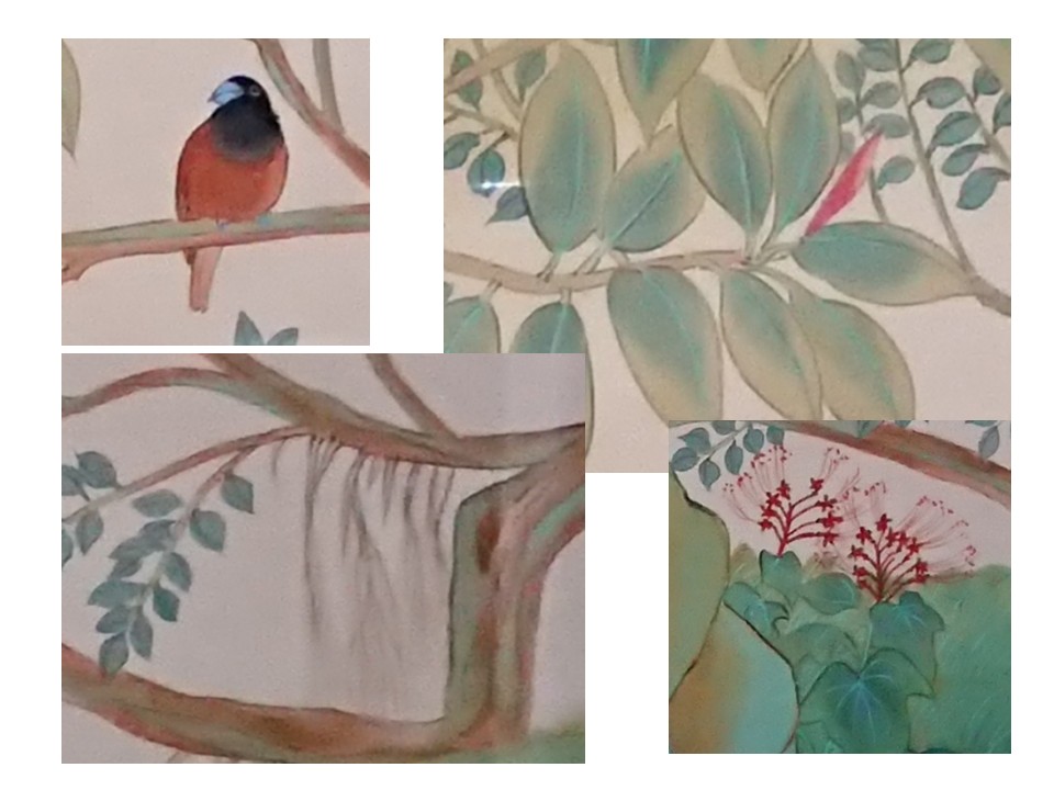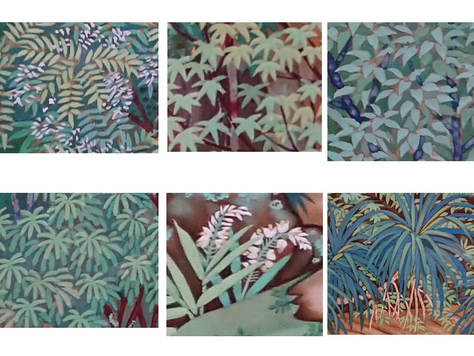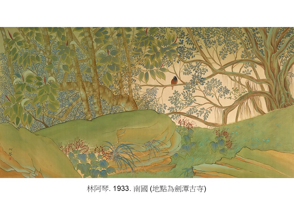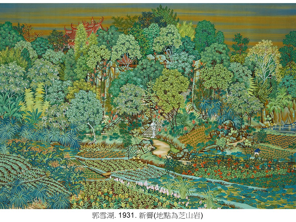 iii.(案例)郭雪湖名作新霽,描繪1931年的台北芝山岩一帶,有天然的鵝掌柴、粗糠柴、林投,也有人工種植的印度橡膠樹、玉米、布袋蓮等等