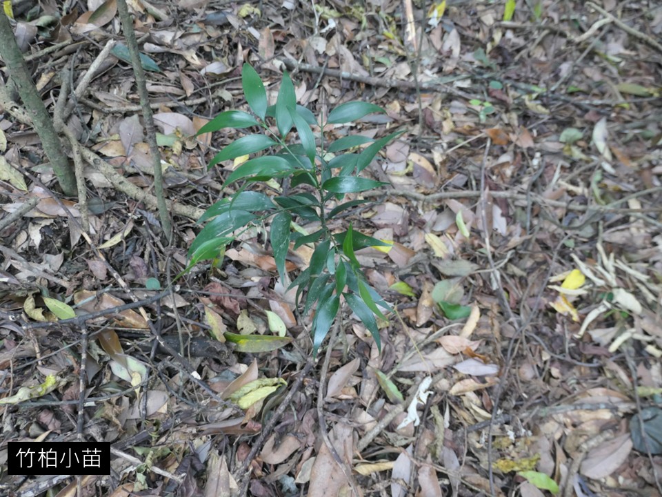 為什麼這麼常在調查被發現的植物,紅皮書會把它列為是瀕臨滅絕?因為「竹柏」根據標本資料,還有文獻,它其實是臺灣南北端分布的植物,南邊是恆春半島,北邊是汐止到基隆這一帶山區,還有陽明山,這是比較確定有天然分布的竹柏,那邊的森林裡面大中小的竹柏都有。這個植物的整個(族群的年齡結構)組成是很健康的,但是在其他地方調查到竹柏,通常都是小苗,為什麼會這樣子?因為,第一個,竹柏是很重要的景觀植物,所以附近只要有公園或是住家,他多少都會種竹柏來當景觀植物,竹柏長大了它的果實很容易靠鳥類傳播出去,它的種實發芽率很高。所以有人把竹柏拿來做種子盆栽在賣,非常會發芽,所以就到中部地區來。