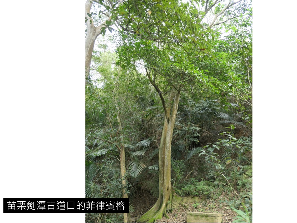 另外還有一個例子是「成熟林樹種」。我舉苗栗劍潭古道口的菲律賓榕的例子,在臺灣低海拔地區應該是以「榕楠林帶」為主,榕楠林帶裡面有幾種成熟林樹種,其中一種是「菲律賓榕」。