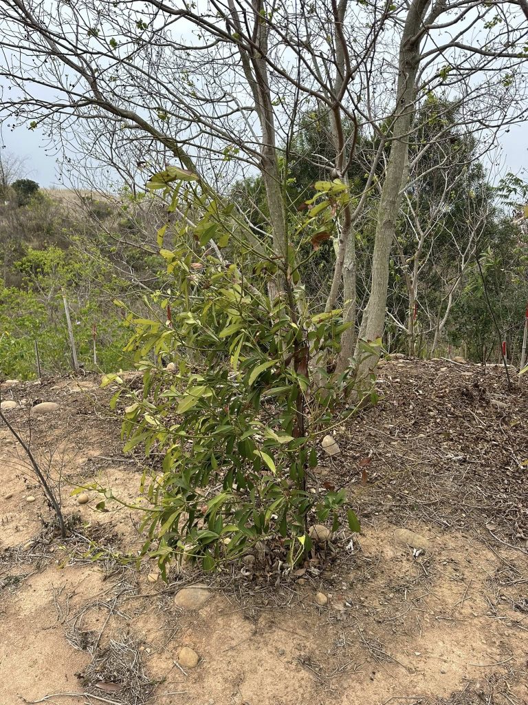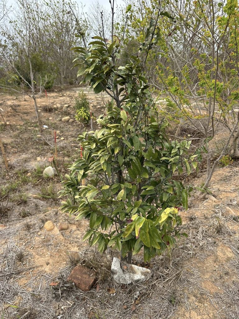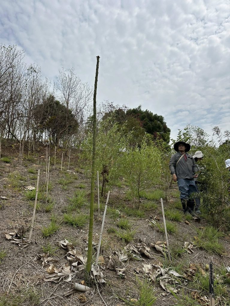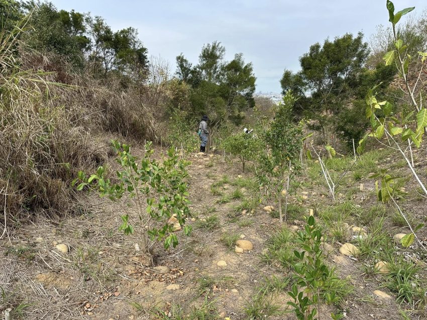 本會2018年大肚山潛在植群的研究,提出大肚山天然植群至少有114種的木本植物,之後我們即展開採種育苗、樹苗種植等工作。2022年在龍目井步道建置復育區,建置前這裡是一片大黍草生地,2022~2025我們陸續種植樹苗,經過四年的努力,2026/3/9進行復育成效查核,此次查核共紀錄116種樹木,我們將這些樹種抽樣量測物高胸徑,其中2022年(第一年)種植的樹苗,許多已達四公尺高,而復育物種達成率也已超過114種的目標,接下來要努力的是建立各種樹木穩定的族群數量,讓他們可以在此自然繁衍。龍目井復育區存活樹種成效查核 2026/3/9