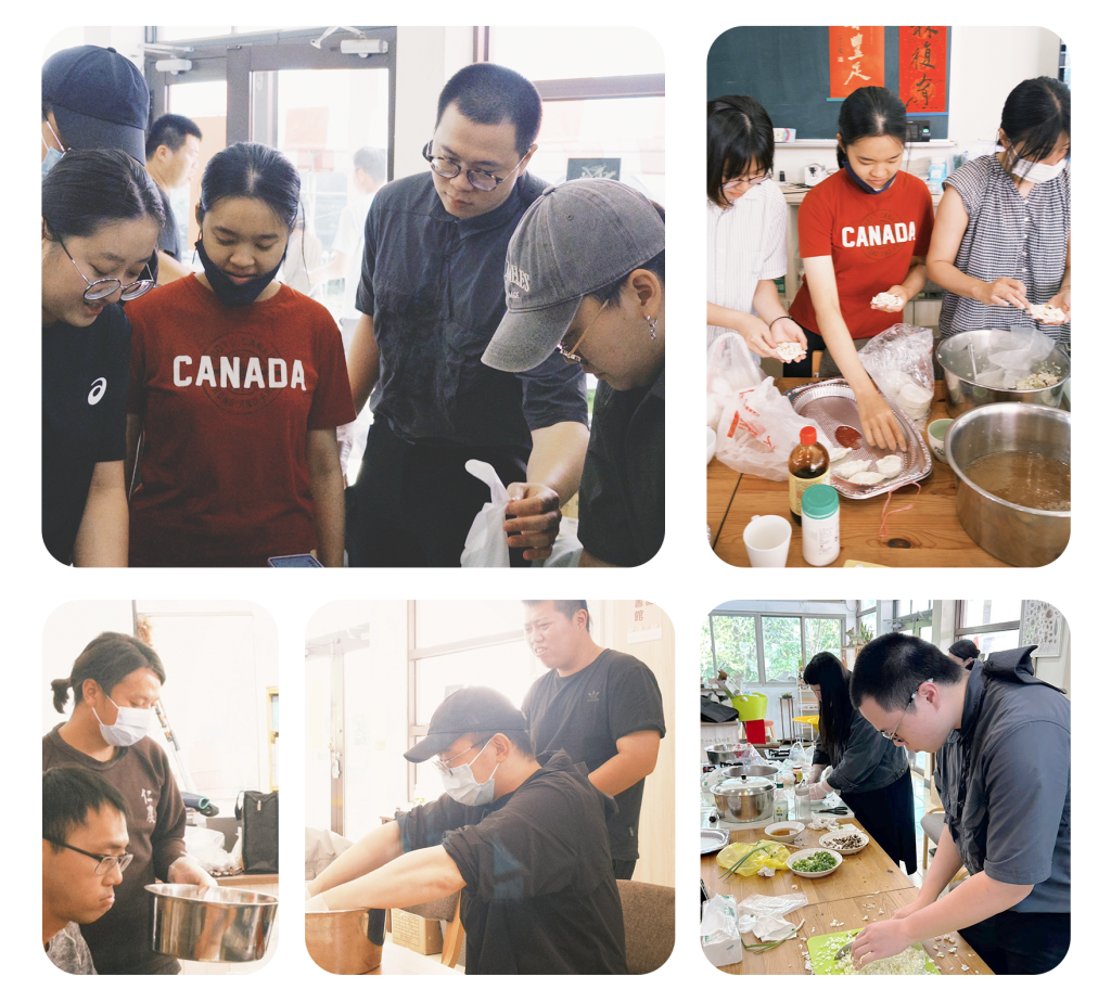 這次從頭開始準備,有人在旁邊搓洗愛玉,有人忙著熬糖水、擠檸檬汁,空氣裡都是清甜的香氣。最熱鬧的當然是準備水餃內餡的時候,為了照顧吃素的夥伴,執行長還很細心地準備了豆干跟木耳,確保每個人都能好好享受共同備餐。