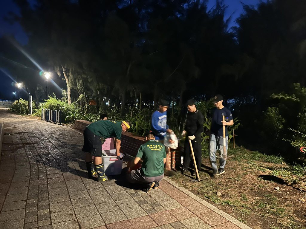 擔心明後天下大雨將今天挖好的植穴淹沒消失,我們挑燈夜戰加班趕工,終於把大安龜殼生態公園復育區1100棵樹苗全部種完,等一下請運源工班去餐廳吃飯,謝謝他們的辛勞。